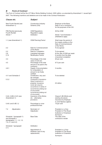 The Form of Contract will be the JCT Minor Works Building Contract, 2005 edition, as amended by Amendment 1, issued April 2007. The following insertions and deletions are to be made in the Contract Particulars:-