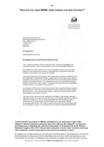 I submit that this accusation to RBK&C subsequent to our denial and in light of Mrs Hillgarth’s Witness Statement admission (para 73) evidences Mrs Hillgarth’s contrariness and dishonesty in repeating this ridiculous observation to all lessees and in her Witness Statement lodged at First Tier Tribunal and is indicative of all her other vindictive and imagi- native fantasies. In other words almost every word & accusation is untrue.
