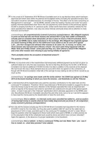 37 Not only did the lessees actually pay the £2,000 Mr Brown-Constable had requested for the reserve (£18,000 in total for the nine flats), but they also paid in addition £867.87 each for the water tank re- placement (£7,810 in total), and £593 each for the communal TV installation (£5,337 in total). Which begs the question what has happened to these funds which were paid to MHML on a false premise (ie on the assumption that all the scheduled work would be done) and which have not been refunded? Again this appears, in the absence of a proper explanation, to be fraudulent.
