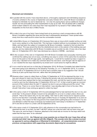43 In parallel with the events I have described above, a thoroughly unpleasant and intimidating sequence of events unfolded in the course of September and early October 2014, when Mr Brown-Constable at- tempted to intimidate me and to blackmail me - not only into paying these various additional charges myself, but into persuading the other leaseholders to pay up as well. This all started with a relatively trivial incident related to two extra keys that I had requested for my tenant in Flat 5 (Maria Stella Scarpellini) for the front door of Mitre House.