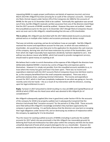 requesting MHML to supply proper justifications and details of expenses incurred, and since March 2014 Mrs Hillgarth has been pressing for an audit of the company’s accounts. Eventually she filed a formal request under Section 476 of the Companies Act 2006 for the accounts of MHML for the year to 31 December 2016 to be audited. Technically this application was served out of time, but Mrs Hillgarth received a written assurance from one of the directors (Jamil Raja) that the 2017 accounts of MHML would be audited. However they were not audited. Indeed the (unaudited) accounts for the year to 31 December 2017 (though filed at Companies House) were not even sent to Mrs Hillgarth, notwithstanding that she was a 25% shareholder.