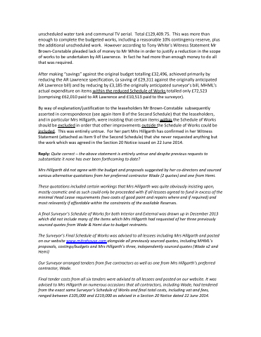 unscheduled water tank and communal TV aerial. Total £129,409.75. This was more than enough to complete the budgeted works, including a reasonable 10% contingency reserve, plus the additional unscheduled work. However according to Tony White’s Witness Statement Mr Brown-Constable pleaded lack of money to Mr White in order to justify a reduction in the scope of works to be undertaken by AR Lawrence. In fact he had more than enough money to do all that was required.