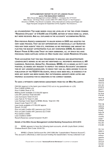 YOUR ACCUSATION THAT THIS WAS PROGRESSED TO MISLEAD AND MISAPPROPRIATE LEASEHOLDER’S MONIES AS WE HAD NOT MENTIONED ALL RECIPIENTS INDIVIDUALLY, AR LAWRENCE, SURVEYOR, AERIALTEC, HOUSEMAN, MHML ETC IS DENIED AS PETTY SUP- POSITION, AS INDEED ANY REQUEST TO INSPECT THE VARIOUS ACCOUNTS’ DOCUMENTA- TION BY ANY LESSEE/LEASEHOLDER, TO WHICH THEY HAD ALL BEEN ADVISED TO DO ON PUBLICATION OF THE YE2014 ACCOUNTS, WOULD HAVE BEEN WELL IN EVIDENCE IF IN- DEED ANY QUERY HAD BEEN RAISED. ANY OUTSTANDING AMOUNTS WERE LISTED AND PROPERLY ACCOUNTED FOR IN CREDITORS IN THE CORRECT MANNER.