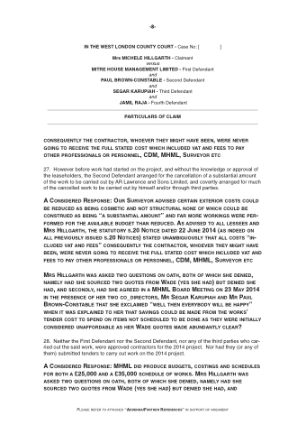 A Considered response: oUr sUrveYor Advised CerTAin exTerior CosTs CoULd Be redUCed As BeinG CosMeTiC And noT sTrUCTUrAL none oF WHiCH CoULd Be ConsTrUed As BeinG “A sUBsTAnTiAL AMoUnT” And FAr More WorKinGs Were per- ForMed For THe AvAiLABLe BUdGeT THAn redUCed. As Advised To ALL Lessees And Mrs HiLLGArTH, THe sTATUTorY s.20 noTiCe dATed 22 JUne 2014 (As indeed on ALL previoUsLY issUed s.20 noTiCes) sTATed UnAMBiGUoUsLY THAT ALL CosTs “in- CLUded vAT And Fees” ConseqUenTLY THe ConTrACTor, WHoever THeY MiGHT HAve Been, Were never GoinG To reCeive THe FULL sTATed CosT WHiCH inCLUded vAT And Fees To pAY oTHer proFessionALs or personneL, CdM, MHML, sUrveYor eTC
