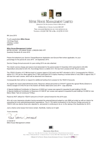 MITre hOUse, 124 KInGs rOAd, LOndOn sW3 4TP Quarterly demands 25 June 2015