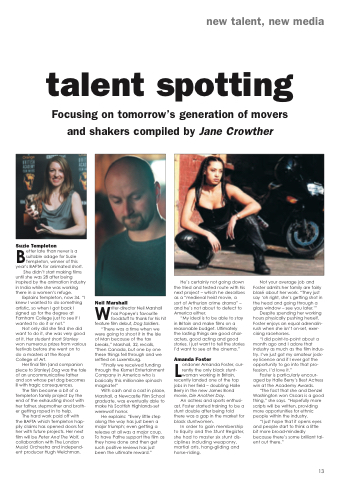 The hard work paid off with the BAFTA which Templeton hap- pily claims has opened doors for her with future projects. Her next film will be Peter And The Wolf, a collaboration with The London Musici Orchestra and independ- ent producer Hugh Welchman.