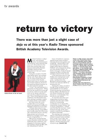 News of Gambon’s unprece- dented small screen hat-trick – following Wives & Daughters and Longitude – arrived early in the proceedings and he acknowl- edged writer-director Stephen Poliakoff “who stopped me doing my usual theatre rubbish” on Perfect Strangers. Poliakoff himself stepped up later to receive the prestigious Dennis Potter Award.