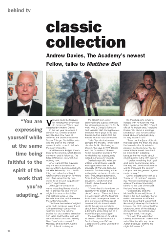 Davies is a prolific writer, yet until he was 50 Davies was still working as a lecturer at the University of Warwick. Since he turned to full-time writing in the mid-eighties, a stream of adapta- tions - including Middlemarch, Pride And Prejudice, Wives And Daughters, Vanity Fair and Othello - have flowed from Davies’ pen.