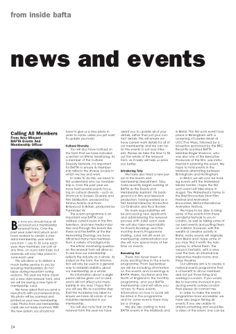 We have also hired a new per- son in the Events and Membership Department. Toby Coke recently began working at BAFTA as the Events and Membership Assistant. His back- ground is in film and television production, having worked as a First Assistant Director, Production Co-Ordinator and Floor Runner.