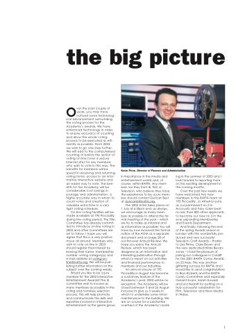 On-line voting facilities will be made available at 195 Piccadilly during the voting period. The Film Committee has already commit- ted to introduce on-line voting in 2003 and other Committees are set to follow. I hope you will agree that this is a very positive move all around. Members who wish to vote on-line in 2003 should register their interest by leaving their name, membership number, voting category(s) and e-mail address at voting-on- line@bafta.org. We will be pub- lishing further information on this subject over the coming weeks.