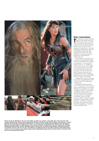 Photos top left: Ian McKellen in The Lord of the Rings; top right: Lucy Lawless as Xena (Sky One); above from left: Three recently completed New Zealand movies being sold world wide by the New Zealand Film Commision. Sam Pillsbury's Crooked Earth had its US premiere at the Arizona Film Festival - an explosive drama starring Lawrence Makoare (left) and Temuera Morrison (Once Were Warriors); Gillian Ashurst's first feature, Snakeskin, won Best Film of the Year Award at the 2001 New Zealand Nokia Film Awards - and stars Melanie Lynskey as Alice in the car; Director Barry Barclay's stunning docu/drama, The Feathers Of Peace, tells the true story of the Moriori, the indigenous tribe of the Catham Islands in New Zealand known for their vow never to take up arms against another human being despite being well able to defeat invaders. Screened for the first time at the Hawaii Film Festival.