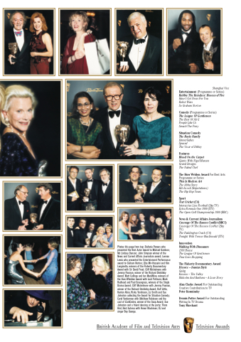 Photos this page from top: Stefanie Powers who presented the Best Actor Award to Michael Gambon; Ms Lindsay Duncan; John Simpson winner of the News and Current Affairs Journalism award; Lennox Lewis who presented the Entertainment Performance award to Graham Norton; Ziba Mir-Hosseini and Kim Longinotto, winners of the Flaherty Documentary Award with Sir David Frost; Cliff Michelmore with Jeremy Paxman, winner of the Richard Dimbleby Award; Matt Collings and Ian MacMillan, winners of the Huw Wheldon Award with Lord Puttnam; Mark Redhead and Paul Greengrass, winners of the Single Drama Award; Cliff Michelmore with Jeremy Paxman, winner of the Richard Dimbleby Award; Ralf Little, Kenton Allen, Ricky Tomlinson, Liz Smith and Sue Johnston collecting the Award for Situation Comedy; Carol Vorderman with Matthew Robinson and the cast of EastEnders, winner of the Soap Award; Sue Johnston and a friend dancing at the party; Thora Hird, Best Actress with Honor Blackman; DJ and singer Boy George.