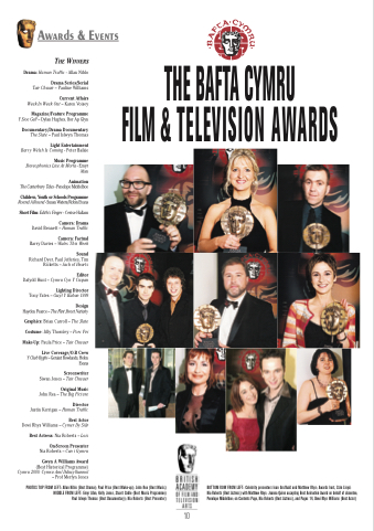 Nia Roberts (Best Actress) with Matthew Rhys; Joanna Quinn accepting Best Animation Award on behalf of absentee, Penelope Middelboe; on Contents Page, Nia Roberts (Best Actress), and Pages 14, Dewi Rhys Williams (Best Actor)