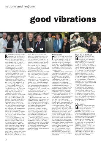DBay-to-day at BAFTA/LA AFTA/LA is dedicated and committed to various other activities as well as screen- ings and Q&As. Recent seminars have explored the business of writing for film, the business of writing for television, and the busi- ness of directing. The next semi- nar will explore the Business of Commercials, and will be moder- ated by John Cleese. Panelists will include many acclaimed international directors and pro- ducers. BAFTA/LA encourages its members and fellow professionals in the Los Angeles entertainment industry to attend these seminars, and especially enjoys welcoming visitors from the UK.