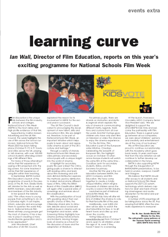 Through a variety of strands, National Schools Film Week pro- vides primary and secondary school pupils with a unique insight into the world of cinema.