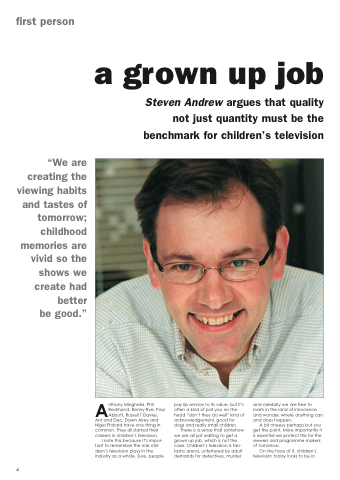 There is a sense that somehow we are all just waiting to get a grown up job, which is not the case. Children’s television is fan- tastic arena, unfettered by adult demands for detectives, murder