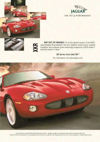 BAT OUT OF HEAVEN. For all the demonic power of the XKRʼs supercharged V8 powerplant, the carʼs adaptive cruise control, satellite navigation and computer active technology suspension (CATS) make it absolute heaven to drive.*