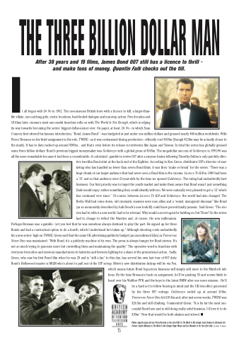 Connery first uttered his famous introduction, “Bond, James Bond” - was budgeted at just under one million dollars and grossed nearly $60 million worldwide. With Pierce Brosnan on his third assignment in the role, TWINE - as it was codenamed during production - officially cost $100m (though $120m may be actually closer to the mark). It has to date racked up around $300m... and that’s even before its release in territories like Japan and Taiwan. In total the series has globally grossed some three billion dollars. Bond’s previous biggest moneymaker was Goldeneye with a global gross of $345m. The megadollar success of Goldeneye in 1995/96 was all the more remarkable because it had been a considerable - if calculated - gamble to revive 007 after a six-year hiatus following Timothy Dalton’s only patchily effec-