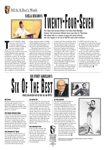 in demand and often accepts the offers, which is why she is Chair of Woman Of The Year Lunch as well as a governor of both the National Film & Television School and Commonwealth Institute. Trinidad-born Floella, a recent addition to the pages of Who’s Who, acknowl- edges that some see her as tough and ambitious. Her own word is “passion- ate”. If there is a chance to make a dif- ference, that chance should be taken ... passionately. The establishment and success of BAFTA’s Children’s Awards testify to that philosophy.