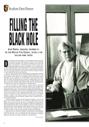 Dawn-of-the-new-century thoughts,” the editor suggested when he asked me to contribute a few words for this first issue of ACADEMY. As I write, the hang- overs from the bonhomie of the “M-word” celebrations have cleared. The Dome is now deemed an “inverted blancmange” by Prince Charles and a possible film studio by those who never filmed in one. As Chairman of the new Film Council I am biased, if not honour-bound, to be a positivist with regard to the future of the Film Industry in this country. But new centuries bring new truths and there is no easy panacea: the Film Council cannot be Clark Kent scooting into a phone box and turning the Film Industry into Superman.
