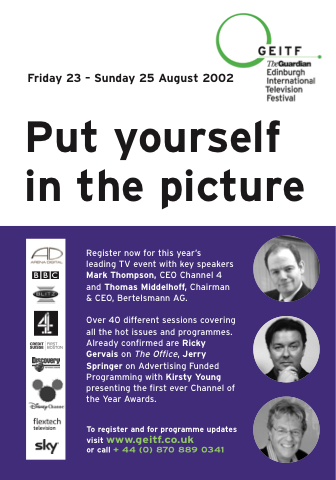Over 40 different sessions covering all the hot issues and programmes. Already confirmed are Ricky Gervais on The Office, Jerry Springer on Advertising Funded Programming with Kirsty Young presenting the first ever Channel of the Year Awards.