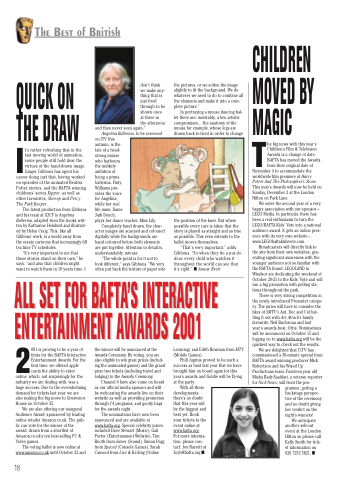 2001 is proving to be a year of firsts for the BAFTA Interactive Entertainment Awards. For the first time, we offered appli- cants the ability to enter online, which, not surprisingly for the industry we are dealing with, was a huge success. Due to the overwhelming demand for tickets last year, we are also making the big move to Grosvenor House on October 25.