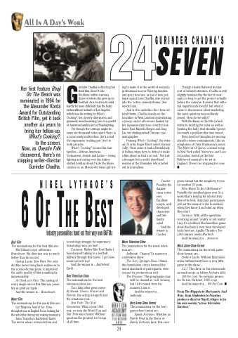 Praising What’s Cooking?, the veter- an US critic Roger Ebert noted, rhetori- cally: “How come it took a British lady of Indian origin born in Africa to make a film about us that’s so real.” Not just a bouquet but a useful shorthand resumé of the filmmaker who started out in journalism.