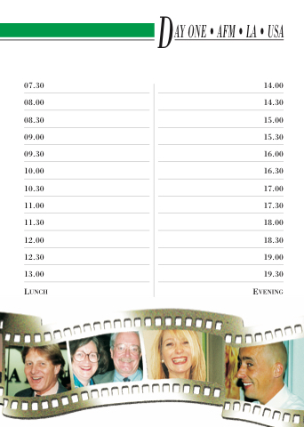DAYONE•AFM•LA•USA 07.30 14.00 08.00 14.30 08.30 15.00 09.00 15.30 09.30 16.00 10.00 16.30 10.30 17.00 11.00 17.30 11.30 18.00 12.00 18.30 12.30 19.00 13.00 19.30 LUNCH EVENING