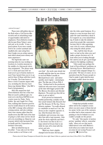 over that” - the work came slowly but steadily until the time he was chosen to succeed Walter Lassally as Merchant-Ivory’s new - and subse- quently, most regular - cinematogra- pher. The film was A Room With A View, “chicken feed to the producers Goldcrest who were more concerned at the time with bigger projects like The Mission, Revolution and Absolute Beginners. The point was they left us alone to get on with it.”