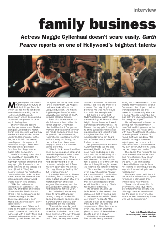 She’s also no wannabe, do- what-it-takes actress, either. Her father, Stephen Gyllenhaal, directed films like A Dangerous Woman and Waterland, in which she made an appearance as a 14 year-old. Her writer mother, Naomi Foner, was Oscar-nominat- ed for Running On Empty, and her brother Jake, three years Maggie’s junior, is a successful young actor too.