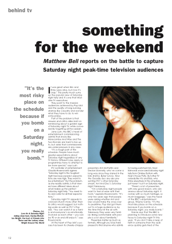 “On a Saturday night people want to feel at ease with their hosts,” explains Rosencrantz. “It’s only two years ago that people were asking whether Ant and Dec would make the cross-over to peaktime. Pop Idol got them out to a huge audience so by the time they hit the air with Takeaway they were very famil- iar. Being comfortable with peo- ple is a lot about familiarity.”