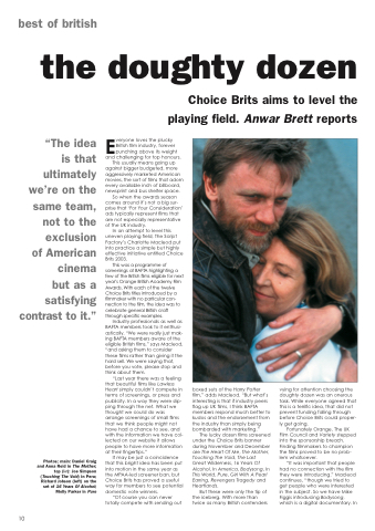 This was a programme of screenings at BAFTA highlighting a few of the British films eligible for next year’s Orange British Academy Film Awards. With each of the twelve Choice Brits titles introduced by a filmmaker with no particular con- nection to the film, the idea was to celebrate general British craft through specific examples.