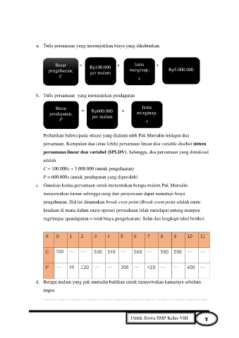 c. Gunakan kedua persamaan untuk menentukan berapa malam Pak Mursalin