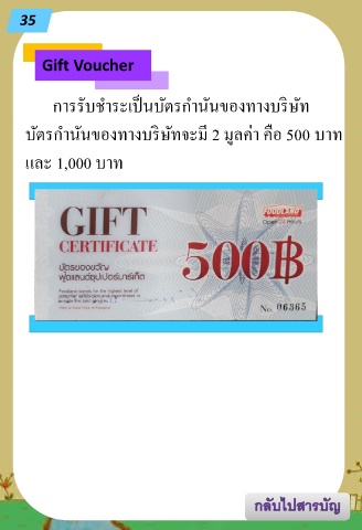 35 Gift Voucher ั ิ ็ การรบช าระเปนบัตรก านันของทางบรษัท ื บัตรก านันของทางบรษัทจะม 2 มูลค่า คอ 500 บาท ี ิ และ 1,000 บาท