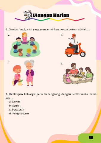 Ulangan Harian 6. Gambar berikut ini yang mencerminkan norma hukum adalah..... a. b. c. d. 7. Kehidupan keluarga perlu berlangsung dengan tertib, maka harus ada..... a. Denda b. Sanksi c. Peraturan d. Penghargaan 88