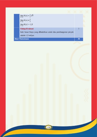 1 lim ( ) = √9 →2 2 3 lim ( ) = →2 2 lim ( ) = 1,5 →2 Tahap Evaluasi 1 Jadi, besar biaya yang dibutuhkan untuk dua pembangunan proyek adalah 1,5 milyar. Skor Maksimum 30 120