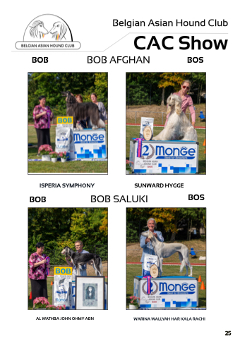 Belgian Asian Hound Club CAC Show BOB BOB AFGHAN BOS ISPERIA SYMPHONY SUNWARD HYGGE BOB BOB SALUKI AL WATHBA JOHN OHMY ABN WARINA WALLYAH HAR KALA RACHI BOS 25