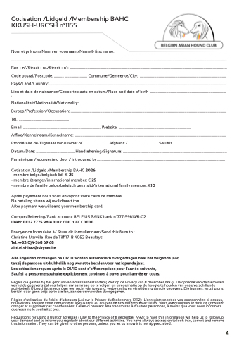 Email: ....................................................................................................... Website: ............................................................................................... Affixe/Kennelnaam/Kennelname: .......................................................................................................................................................................................................... Propriétaire de/Eigenaar van/Owner of....................................Afghans / ....................................... Salukis