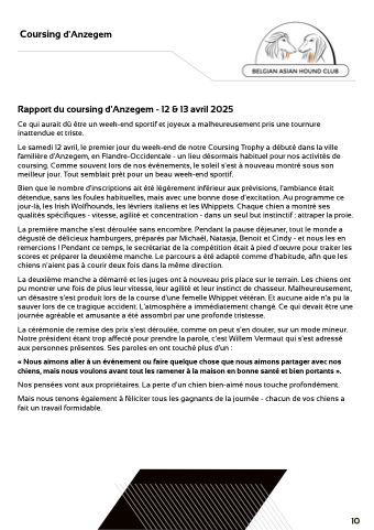 en en Flandre-Occidentale - - un lieu désormais habituel pour nos activités de d de coursing Comme souvent lors de nos événements le le soleil s'est à nouveau montré sous son meilleur jour Tout semblait prêt pour un beau week-end sportif Bien que le l nombre d'inscriptions ait ait été légèrement inférieur aux prévisions l'ambiance était détendue sans les les les foules habituelles mais avec une bonne dose d'excitation Au programme ce jour-là les les les Irish Wolfhounds les les les lévriers italiens et et les les les Whippets Chaque chien à a a a montré ses qualités spécifiques - - vitesse agilité et concentration - - dans un seul but instinctif : attraper la proie La première manche s'est déroulée sans encombre Pendant la pause déjeuner tout l le monde a a a a a a a dégusté d de d délicieux hamburgers préparés par par Michaël Natasja Benoit et et Cindy - et et nous les en en remercions ! Pendant ce temps le le secrétariat de la compétition était à pied d'œuvre pour traiter les scores et préparer la deuxième manche Le parcours a a a a a a a a a été adapté comme d'habitude afin que les chiens n'aient pas à courir deux fois dans la même direction La deuxième manche a a a a à a a a démarré et les juges ont ont à nouveau pris place sur le le terrain Les chiens ont ont pu montrer une fois de de plus leur leur leur vitesse leur leur leur agilité et leur leur leur instinct de de chasseur Malheureusement un un un désastre s'est produit lors d de de la la course d'une femelle Whippet vétéran Et aucune aide n’a pu la la sauver lors de de de ce tragique accident L'atmosphère a a a a a a a a immédiatement changé Ce qui devait être une journée agréable et amusante a a a a a a a été assombri par une profonde tristesse La cérémonie de de d de remise des prix s'est déroulée comme on on peut s'en douter sur un mode mineur Notre président étant trop affecté pour prendre la parole c'est Willem Vermaut qui s'est adressé aux personnes présentes Ses paroles en en ont touché plus d'un : « Nous aimons aimons aller à un événement ou ou ou faire quelque chose que que que nous aimons aimons partager avec nos chiens mais mais nous voulons avant tout les ramener à la maison en en en en bonne santé et bien portants » Nos pensées vont aux propriétaires La perte d'un chien bien-aimé nous touche profondément Mais nous tenons également à féliciter tous les gagnants de de la journée - chacun de de vos chiens a a à a a a a a fait un travail formidable 10