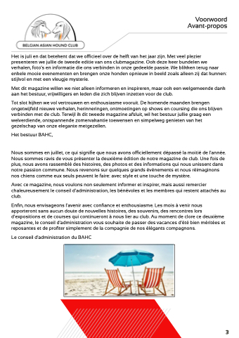 Het is juli en en dat dat betekent dat dat we officieel over de helft van het jaar zijn Met veel plezier presenteren we we we jullie de de de de tweede editie van ons clubmagazine Ook deze keer bundelen we we we verhalen foto’s en en en en informatie die ons verbinden in in in onze gedeelde passie We blikken terug naar enkele mooie evenementen en en en en en en en en en en brengen onze honden opnieuw in beeld zoals alleen zij dat kunnen: stijlvol en en met een vleugje mysterie Met dit magazine willen we we niet alleen informeren en en en en en en en inspireren maar ook een een een welgemeende dank aan het bestuur vrijwilligers en en en en leden die zich blijven inzetten voor de de club Tot slot kijken we we vol vertrouwen en en en en en en en en enthousiasme vooruit De komende maanden brengen ongetwijfeld nieuwe verhalen herinneringen ontmoetingen op shows en en en en en coursing die ons blijven verbinden met de de de club Terwijl ik dit tweede magazine afsluit wil het bestuur jullie graag een welverdiende ontspannende zomervakantie toewensen en en en en en en en simpelweg genieten van het gezelschap van onze elegante metgezellen Het bestuur BAHC Nous sommes en en juillet ce qui signifie que nous avons officiellement dépassé la moitié d de l'année Nous sommes ravis de de de de de vous présenter la deuxième édition de de de de de notre magazine de de de de de club Une fois de de de de de plus nous nous avons rassemblé des des des histoires des des des photos et des des des informations qui nous nous unissent dans notre passion commune Nous revenons sur quelques grands événements et nous réimaginons nos chiens comme eux seuls peuvent le le faire: avec style et une touche de mystère Avec ce magazine nous voulons non seulement informer et inspirer mais aussi remercier chaleureusement le le le le le conseil d'administration les les les bénévoles et les les les membres qui restent attachés au club Enfin nous nous envisageons l'avenir avec confiance et enthousiasme Les mois à venir venir nous nous apporteront sans aucun doute de de de nouvelles histoires des des souvenirs des des rencontres lors d'expositions et de de de courses qui continueront à nous lier au club Au moment de de de clore ce deuxième magazine le conseil d'administration vous souhaite de de passer des vacances d'été bien méritées et reposantes et de de de profiter simplement de de de la compagnie de de de nos élégants compagnons Le conseil d'administration du BAHC