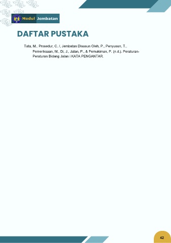 Modul Jembatan DAFTAR PUSTAKA Tata, M., Prosedur, C. /, Jembatan Disusun Oleh, P., Penyusun, T., Pemeriksaan, M., Di, J., Jalan, P., & Pemukiman, P. (n.d.). Peraturan- Peraturan Bidang Jalan i KATA PENGANTAR. 42