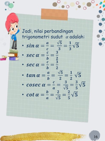 Jadi, nilai perbandingan trigonometri sudut adalah: • = = = • = = • = = • = = = • = = = • = = = 16