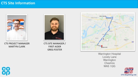 CTS Site Information CTS PROJECT MANAGER CTS SITE MANAGER / MARTYN CLARK FIRST AIDER NEAREST A&E GREG FOSTER Warrington Hospital Lovely Lane Warrington Cheshire WA5 1QG 28