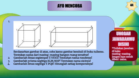 3. Gambarlah prisma segitiga KLM.NOP! Tentukan nama sisinya!