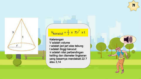 71 Keterangan V adalah volume r adalah jari-jari alas tabung t adalah tinggi kerucut π adalah nilai perbandingan keliling dan diameter lingkaran yang besarnya mendekati 22 7 atau 3,14