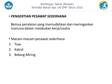 Bimbingan Teknis (Bimtek) Remidial Bahan Ajar UN SMP Tahun 2016 • PENGERTIAN PESAWAT SEDERHANA Semua peralatan yang memudahkan dan meringankan manusia dalam melakukan kerja/usaha • Macam-macam pesawat sederhana 1. Tuas 2. Katrol 3. Bidang Miring