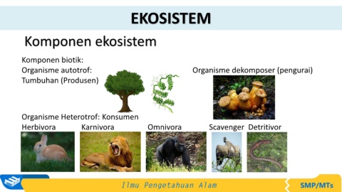 EKOSISTEM Komponen ekosistem Komponen biotik: Organisme autotrof: Organisme dekomposer (pengurai) Tumbuhan (Produsen) Organisme Heterotrof: Konsumen Herbivora Karnivora Omnivora Scavenger Detritivor