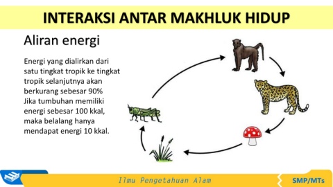 INTERAKSI ANTAR MAKHLUK HIDUP Aliran energi Energi yang dialirkan dari satu tingkat tropik ke tingkat tropik selanjutnya akan berkurang sebesar 90% Jika tumbuhan memiliki energi sebesar 100 kkal, maka belalang hanya mendapat energi 10 kkal.