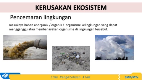 KERUSAKAN EKOSISTEM Pencemaran lingkungan masuknya bahan anorganik / organik / organisme kelingkungan yang dapat mengganggu atau membahayakan organisme di lingkungan tersebut.