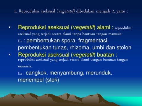 1. Reproduksi aseksual (vegetatif) dibedakan menjadi 2, yaitu :